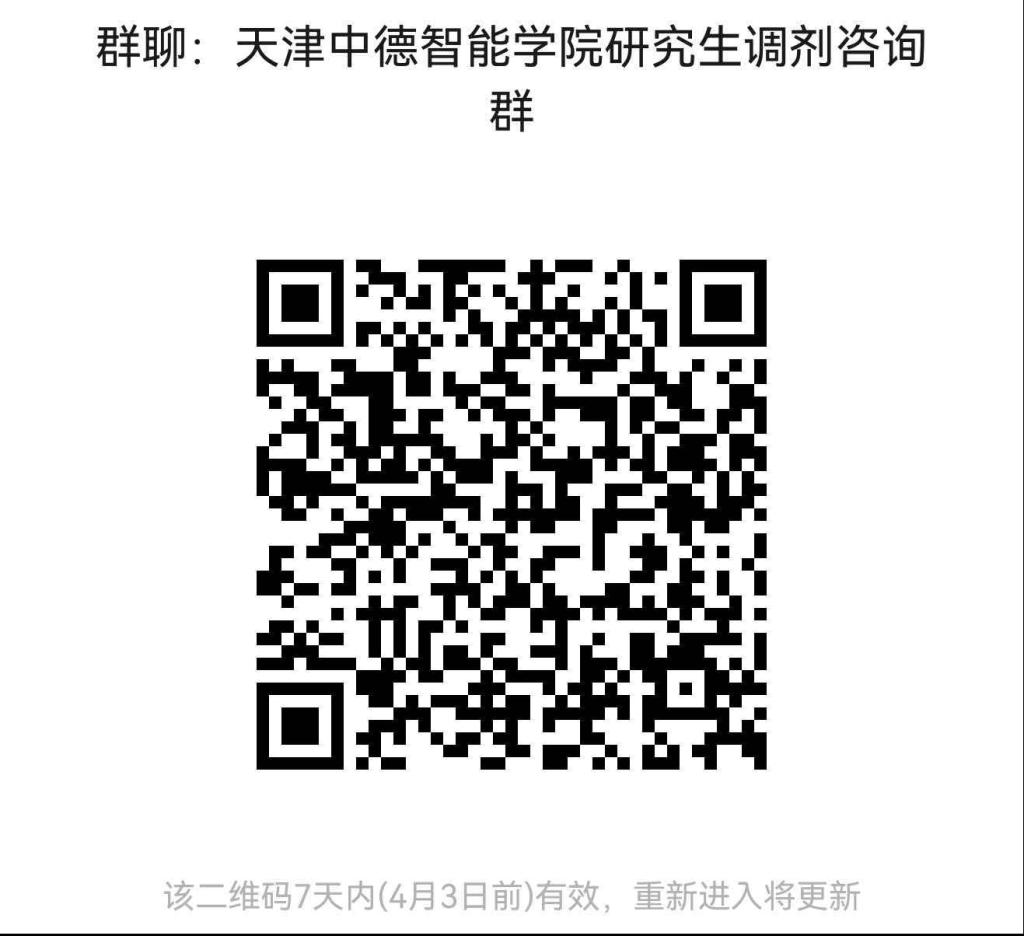 5.报考“退役大学生士兵计划”的考生,申请调剂至普通计划,按照调剂的程序和相关要求进行,须与同批次申请调剂的考生一起按照学院相关要求、规则进行排名,择优进入复试。 6.复试费用:依据天津市有关文件规定,收取复试费90元/生。登录学校科技与研究生处网站(https://kjc.tsguas.edu.cn),通过扫描缴费通知中财务处提供的缴费二维码进行缴费。 7.第一批复试后有缺额的专业将继续调剂,考生须及时关注调剂系统缺额情况和我校科技与研究生处、学院网站相关通知。 四、联系方式 智能制造学院网址:https://znzz.tsguas.edu.cn/ 智能制造学院电子邮箱:znyjs@tsguas.edu.cn 智能制造学院联系电话:022-28771911 通讯地址:天津海河教育园区雅深路2号 邮政编码:300350 天津中德应用技术大学智能制造学院2026年考研调剂咨询群二维码: