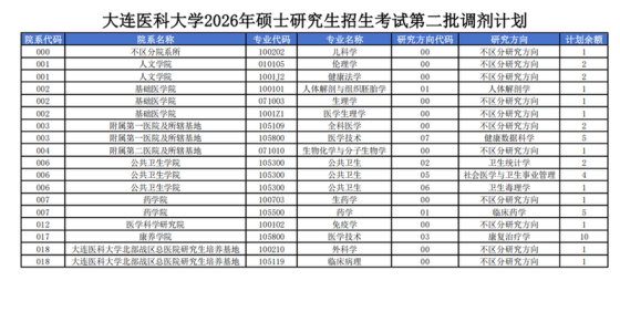 按照《教育部关于印发〈2026年全国硕士研究生招生工作管理规定〉的通知》(教学〔2025〕2号)、《大连医科大学2026年硕士研究生招生复试录取工作办法》,结合我校第一批调剂考生拟录取情况,开展我校2026年硕士研究生招生第二批调剂工作。现将调剂工作相关事宜公告如下。一、调剂计划见《大连医科大学2026年硕士研究生招生考试第二批调剂计划》(附件1)。本批次调剂过程中,将根据报名生源情况,及时调整招生计划,各专业计划及实际录取人数可能略有调整,具体以实际招生人数为准。二、调剂要求(一)调剂复试基本分数线调剂考生初试成绩(
