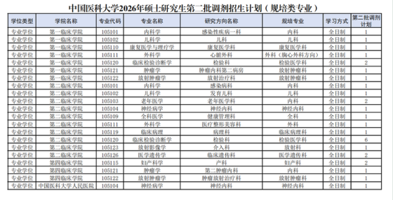 一、第二批调剂招生专业及计划信息见附件1、2 二、报名时间及方式 报名时间:2026年4月12日22:00-4月13日12:00。 报名方式:请考生在报名截止时间前登录中国研究生招生信息网(https://yz.chsi.com.cn/)填报调剂信息,每名考生仅限填报我校1个调剂志愿(填写多条志愿的重复报名者将以报名时间最晚的一条报名记录为准)。 三、调剂基本条件 调剂相关要求请查看《中国医科大学2026年全国硕士研究生招生章程》(https://www.cmu.edu.cn/cmuyjs/info/1900/9712.htm)和《中国医科大学2026年硕士研究生招生复试录取方案》(节选)(附件3),请