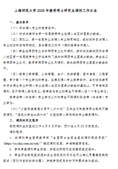https://yjsc.shnu.edu.cn/9a/1d/c17243a825885/page.htm点击链接阅读调剂详情介绍,结合自己的情况,积极准备填报温馨提示:登录51考研网电脑站官网,查看调剂信息更方便