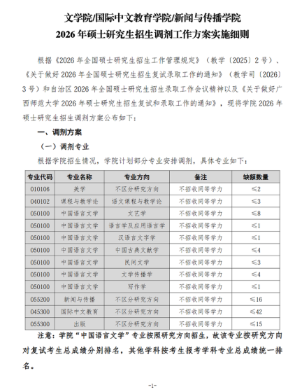 根据教育部《2026年全国硕士研究生招生工作管理规定》、《2026全国硕士研究生招生考试进入复试的初试成绩基本要求》以及广西师范大学的相关招生政策及要求,特制定马克思主义学院2026年全日制硕士研究生招生调剂方案。一、调剂专业(以下专业均为全日制)根据招生情况,学院部分专业尚有部分缺额需进行调剂,具体专业如下:专业名称专业代码研究方向学制学位类型备注学科教学(思政)04510200不区分研究方向三年专业学位不招收同等学力考生哲学01010002中国哲学三年学术学位04伦理学三年学术学位政治经济学02010100不区分研究方向三年学术
