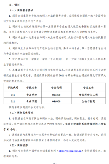 根据《教育部关于印发〈2026年全国硕士研究生招生工作管理规定〉的通知》,结合我校实际情况,现将我校调剂工作通知如下:一、调剂基本条件(一)调剂考生初试成绩须符合第一志愿报考专业在调入地区的国家分数线,并符合调入专业的报考条件。(二)调剂考生第一志愿专业与调入专业初试科目相同相近,或初试科目与调入专业初试科目相同相近。涉及第一志愿专业范围及其他学术要求由招生学院规定。(三)考生在照顾专业与非照顾专业之间调剂,其初试成绩均须符合调入地区第一志愿报考专业所在学科门类的非照顾专业国家分数线。考生在工学照顾