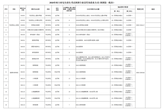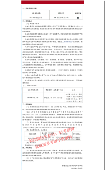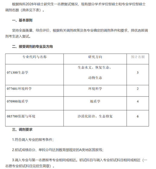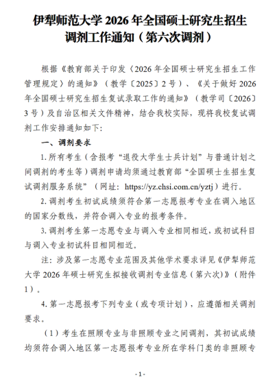 根据《2026年全国硕士研究生招生工作管理规定》(教学〔2025〕2号)《关于做好2026年全国硕士研究生招生复试录取工作的通知》(教学司〔2026〕3号)《关于做好自治区2026年全国硕士研究生招生复试录取工作的通知》(新教考〔2026〕12号)文件精神,为做好我校2026年硕士研究生招生调剂工作,结合学校实际情况,制定此调剂办法:一、调剂基本要求1.须符合招生简章中规定的调入专业的报考条件,必须通过全国统一的“全国硕士研究生招生调剂服务系统”进行。2.调剂考生初试成绩须符合第一志愿报考专业在调入地区的全国初试成绩基本要求,且符