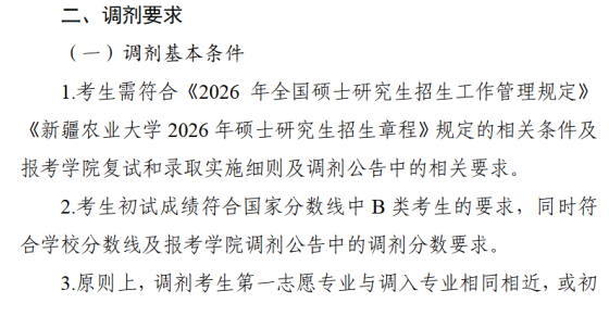 根据《2026年全国硕士研究生招生工作管理规定》(教学〔2025〕2号)和《关于做好2026年全国硕士研究生招生复试录取工作的通知》(教学司〔2026〕3号)文件及相关会议精神,按照《新疆农业大学2026年硕士研究生招生复试和录取工作方案》(新农大发〔2026〕11号)要求,结合学校实际,现将我校调剂工作通知如下。一、基本要求我校各招生学院在第一志愿合格生源不足时,可组织开展调剂工作。各招生学院接收所有调剂考生(含报考“退役大学生士兵”专项计划与普通计划之间调剂的考生等)均通过研招网“全国硕士生招生复试调剂服务系统”进行。