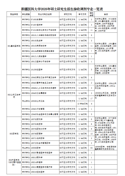 根据《2026年全国硕士研究生招生工作管理规定》(教学〔2025〕2号)和《关于做好2026年全国硕士研究生招生复试录取工作的通知》(教学司〔2026〕3号)文件及相关会议精神,按照《新疆医科大学2026年硕士研究生招生复试录取工作办法》,结合学校实际,现将我校调剂相关工作公告如下:一、时间安排(一)4月8日0:00--14:00(北京时间):开启教育部调剂系统。(二)4月8日下午:招生学院发送复试通知,考生确认接受复试通知。(三)4月9--14日:考生线上提交复试相关材料,招生学院组织资格审核及现场复试,请考生提前做好复试及出行准备,具