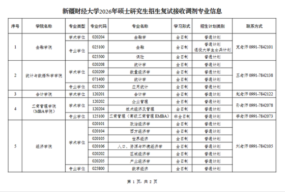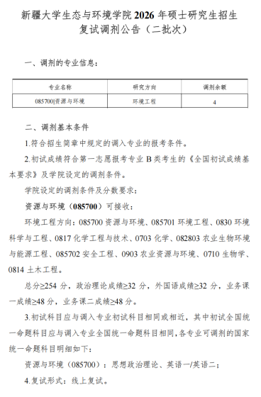 根据教育部《2026年全国硕士研究生招生工作管理规定》(教学〔2025〕2号,以下简称《管理规定》)、《关于做好2026年全国硕士研究生招生复试录取工作的通知》(教学司〔2026〕3号)、《关于做好自治区2026年全国硕士研究生招生复试录取工作的通知》(新教考〔2026〕12号)等文件精神和要求,为做好我校2026年硕士研究生招生复试调剂工作,结合学校实际情况,现将我校调剂工作通知如下。一、调剂基本要求1.初试成绩(含加分)须符合第一志愿报考专业在调入地区的全国初试成绩基本要求,并符合我校招生章程中规定的调入专业的报考条件。2.第