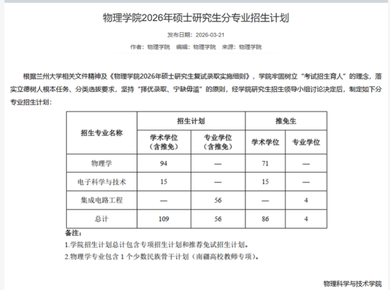 我院2026年硕士研究生调剂工作将于4月8日教育部“中国研究生招生信息网”调剂系统开通后正式开始,调剂招生名额为:物理学46,学科教学(物理)10,光电信息工程23,材料工程38(名额最终以研招网公布为准)。为便于考生了解相关调剂情况,现将调剂要求、拟接收调剂专业等信息公布如下,有调剂需求考生可在国家预调剂系统报名,及时填报意向信息。一、调剂要求严格按照学校规定的调剂原则开展调剂工作。具体专业及缺额信息以中国研究生招生信息网“全国硕士生招生调剂服务系统”公布的调剂信息为准。调剂基本要求如下:1.符合调入专业的报