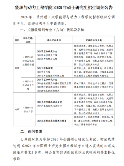 一、考生调剂基本要求1.调剂对象为参加2026年全国硕士研究生考试、初试成绩达到国家规定的B类及以上分数线(含总分与单科成绩分数线)的考生。2.申请调剂考生第一志愿报考学科/专业与我院招生学科/专业相同或相近。3.申请调剂我校的考生,须在全国硕士研究生招生调剂服务系统开通后及时完整填报相关信息。二、拟接收调剂专业(方向)代码及名称学位类型调剂专业及代码初试科目一志愿专业代码范围本科专业范围学术学位动力工程及工程热物理(080700)101思想政治理论0807、0801、0802、0804、0808、0811、0814、0824、0825、0826新能源科学