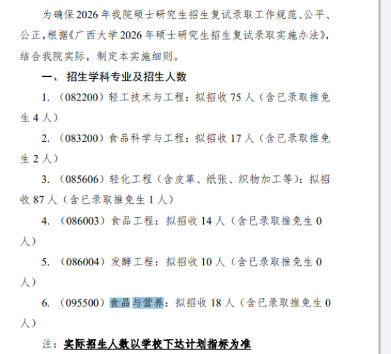 关于公布广西大学轻工与食品工程学院2026年硕士研究生拟复试名单(第一志愿)的通知对比以上数据: 轻工技术与工程,083200食品科学与工程,086003食品工程,轻化工程(含皮革、纸张、织物加工等),086004发酵工程,一志愿上线人数不足结合自己的情况,积极准备,如需删除请联系电话18137782070温馨提示:推荐使用51考研网电脑站官网查看信息更方便 www.51kywang.com