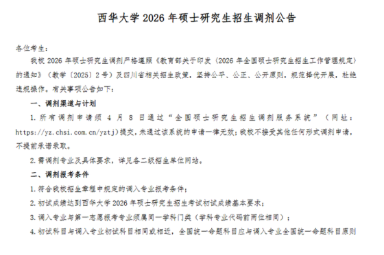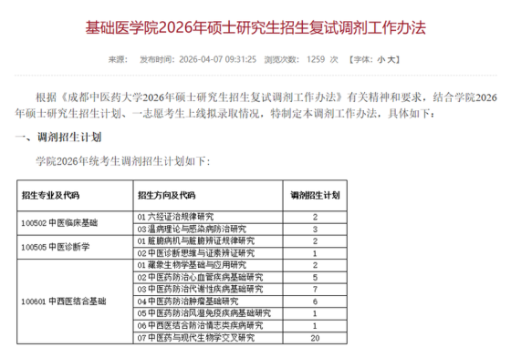 调剂工作是研究生招生复试的重要组成部分,根据《教育部关于印发〈2026年全国硕士研究生招生工作管理规定〉的通知》(教学〔2025〕2号)、《关于做好2026年全国硕士研究生招生复试录取工作的通知》(教学司〔2026〕3号)等文件和四川省有关要求,结合学校实际,制定我校2026年硕士研究生招生调剂工作办法。一、考生调剂基本条件1.调剂考生初试成绩须符合第一志愿报考专业在国家一区的初试成绩基本要求,且达到我校所划定的接收调剂学科(专业)考生初试成绩基本要求(见附表)。2.符合我校调入专业的报考条件(详见《成都医学院2026年硕士