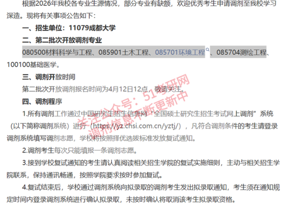 根据2026年我校各专业生源情况,部分专业有缺额,欢迎优秀考生申请调剂至我校学习深造。现将有关事项公告如下:一、招生单位:11079成都大学二、接收调剂专业及其相关要求如下:专业代码及名称接收调剂一志愿专业范围类型初试统考科目080500材料科学与工程0805材料科学与工程、0801力学、0806冶金工程、0817化学工程与技术、0822轻工技术与工程学术学位①101思想政治理论②201英语(一)③302数学(二)081200计算机科学与技术08工学范围内,与081200计算机科学与技术相同或相近学术学位①101思想政治理论②201英语(一)③301数学(一)④