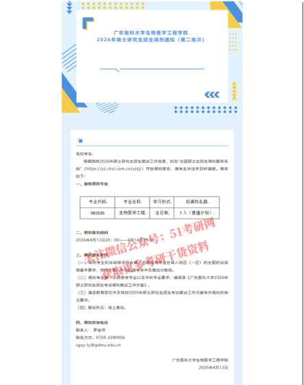 各位考生:根据我院2026年硕士研究生招生复试工作进度,拟在“全国硕士生招生调剂服务系统”(https://yz.chsi.com.cn/yztj/)开放调剂报名,请考生关注并及时填报。具体如下:一、调剂专业及名额专业代码专业方向调剂缺额(普通计划专项)调剂缺额(退役老兵专项)071003生理学30086000生物与医药110100101人体解剖与组织胚胎学50二、调剂报名时间2026年4月12日21:00-2026年4月13日11:00三、调剂报名条件(一)调剂考生初试成绩须符合第一志愿报考专业在调入地区(一区)的全国初试成绩基本要求,并符合调入专业的报考条件及复试分数线。