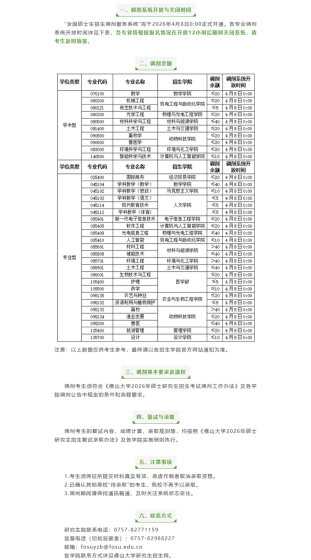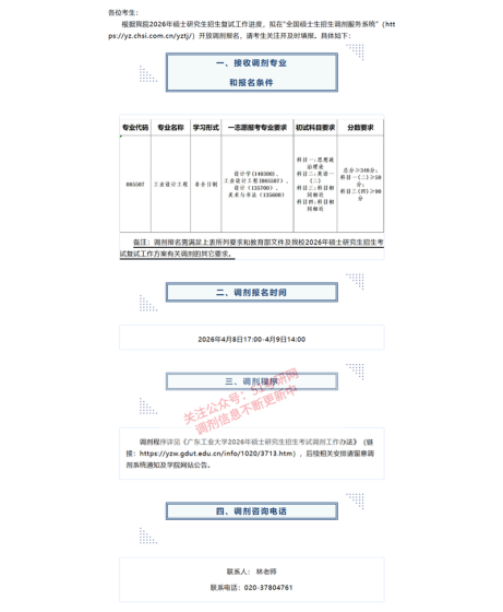 随着我校研究生复试工作的开展,部分专业有调剂需求(具体详见附表: 广东技术师范大学2026年硕士研究生拟调剂专业及计划一览表(含具体计划数).pdf),请有意愿的考生在研招网https://yz.chsi.com.cn/调剂系统报考,欢迎广大考生登录研招网选报我校。请报考我校的考生认真阅读我校复试调剂办法及招生章程(1.复试调剂办法:https://yjszs.gpnu.edu.cn/info/1154/2628.htm。2.招生简章:https://yjszs.gpnu.edu.cn/info/1154/2565.htm)相关报考要求。注:第一志愿为全日制的专业只能调剂我校全日制专业,不得调剂我校非全日制专业,第一志