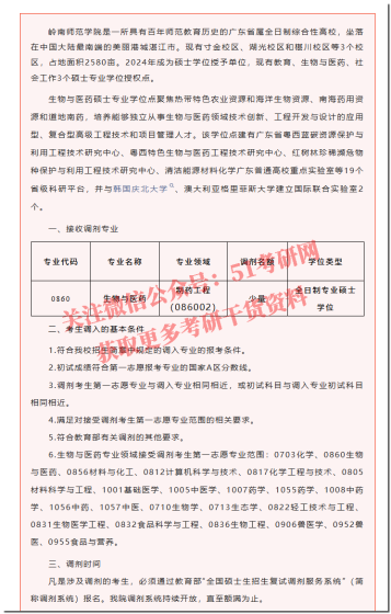 一、接收调剂考生专业及代码序号类型学习方式调剂专业第一志愿报考专业接收范围统考科目要求1专业型全日制086000生物与医药0703化学;0710生物学;0832食品科学与工程;0860生物与医药;101思想政治理论、201英语一或204英语二2学术型全日制071300生态学0710生物学;0713生态学;101思想政治理论、201英语一或204英语二二、调剂要求:1.符合调入专业在华南师范大学2026年硕士研究生招生简章上公布的报考条件。2.初试成绩符合第一志愿报考专业的A类考生分数线。3.调入专业与第一志愿报考专业相同或相近。第一志愿专业初试科目与调入专业初试