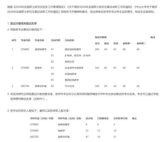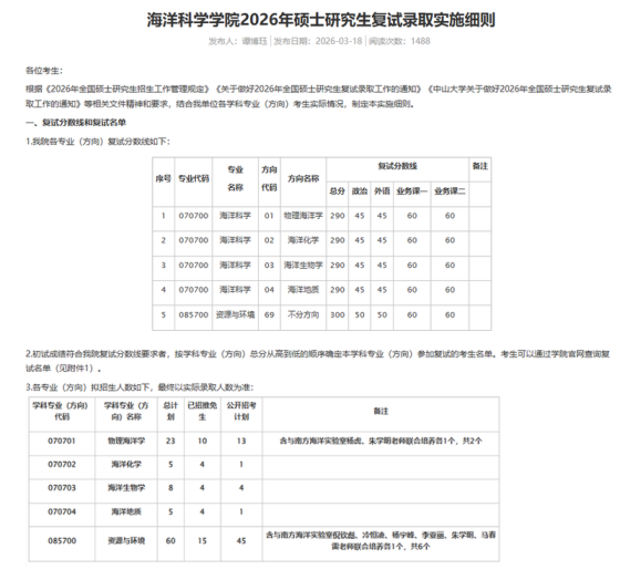 中山大学海洋科学学院2026年硕士研究生复试结果(第一批)对比以上数据: 资源与环境,一志愿上线人数不足结合自己的情况,积极准备,如需删除请联系电话18137782070温馨提示:推荐使用51考研网电脑站官网查看信息更方便 www.51kywang.com