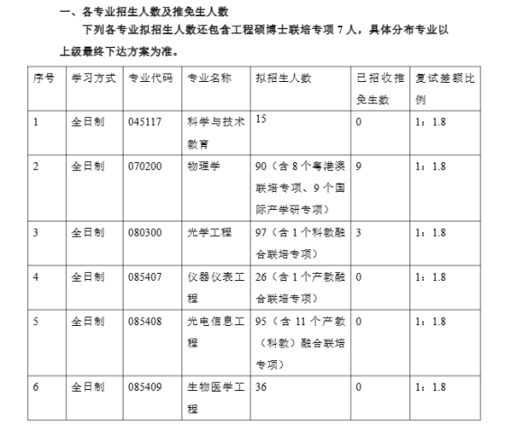 一、接收调剂基本信息我院接受调剂专业信息如下:接收调剂专业代码及名称接收调剂方向代码及名称拟调剂招生计划080900电子科学与技术69不分方向5注:具体调剂招生计划以实际录取人数为准。二、调剂要求(一)符合教育部和学校的调剂政策要求。(二)接受考生调剂的第一志愿专业范围:第一志愿报考我院“光学工程”、“信息与通信工程”、“集成电路工程”、“光电信息工程”、“通信工程(含宽带网络、移动通信等)”专业,达到我院复试分数线且复试合格的优秀生源。除以上专业外,不接受其他专业的考生调剂。(三)初试科目与成绩要求:1