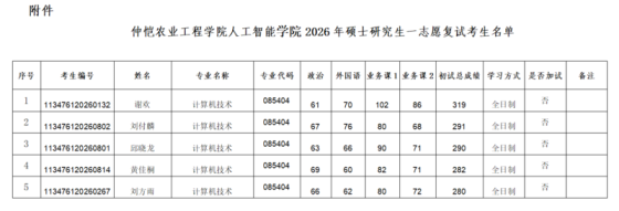 依据教育部有关文件精神,按照《仲恺农业工程学院2026年硕士研究生招生复试录取办法》,结合本学院实际,我院制定2026年硕士研究生招生复试工作细则,具体如下:一、复试名单确定第一志愿复试阶段全日制和非全日制复试比例均为1:1.2,按考生的初试成绩择优确定复试名单(若最后一名出现多人同分时,全部进入复试名单)。考生初试成绩须达到我校2026年硕士研究生招生考试考生进入复试的初试成绩基本要求。一志愿复试名单见附件,调剂考生名单于调剂阶段公布。具体拟招生人数以学校下达至我院的招生数为准,将根据实际招生情况进行调整,请