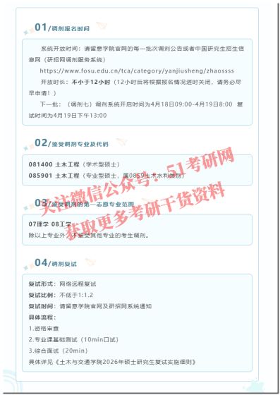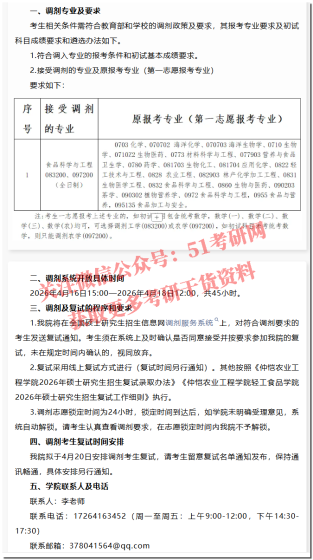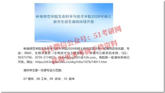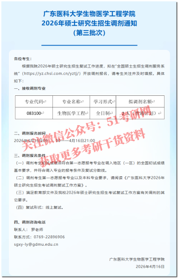 各位考生:根据我院2026年硕士研究生招生复试工作进度,拟在“全国硕士生招生调剂服务系统”(https://yz.chsi.com.cn/yztj/)开放调剂报名,请考生关注并及时填报。具体如下:一、接收调剂专业专业代码专业名称学习形式拟调剂名额100700药学全日制3人(普通计划)140600纳米科学与工程全日制1人(士兵专项计划)二、调剂报名时间2026年4月16日0:00-4月16日15:00三、调剂报名条件(一)调剂考生初试成绩须符合第一志愿报考专业在调入地区(一区)的全国初试成绩基本要求,并符合调入专业的报考条件及复试分数线。(二)调剂考生第一志愿报