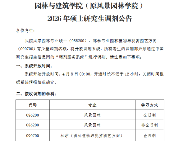 根据我校2026年硕士研究生招生计划及第一志愿考生上线情况,以下学科(专业)接收调剂考生:调剂考生进入复试的相关政策按照《湖南农业大学2026年硕士研究生调剂复试办法》执行。符合条件的调剂考生,须在“中国研究生招生信息网”(简称研招网)的“全国硕士研究生招生调剂服务系统”(简称调剂系统)开通后填报调剂志愿。学校通过研招网调剂系统向调剂考生发送复试通知。考生须在规定时间内予以确认,否则视为放弃复试资格。复试结束后,学校通过研招网调剂系统向拟录取的调剂考生发送拟录取通知,考生须在规定时间内予以确认,否则视为