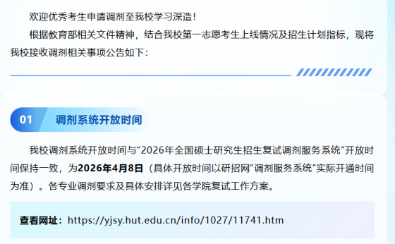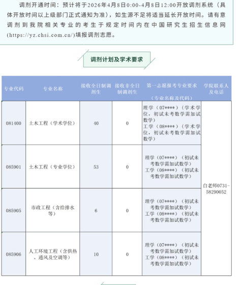 为全面贯彻落实《教育部关于印发〈2026年全国硕士研究生招生工作管理规定〉的通知》(教学〔2025〕2号)、《关于做好2026年全国硕士研究生招生复试录取工作的通知》(教学司〔2026〕3号)、《湖南科技大学2026年硕士研究生复试录取工作方案》等相关规定,切实规范我院2026年硕士研究生调剂复试工作程序,维护广大考生合法权益,经研究,制定本方案。一、调剂系统开放时间我院2026年硕士研究生招生考试部分专业尚有调剂计划,预计将于2026年4月8日0:00-4月8日12:00开放调剂系统(具体开放时间以上级部门正式通知为准),如生源不足将适当延