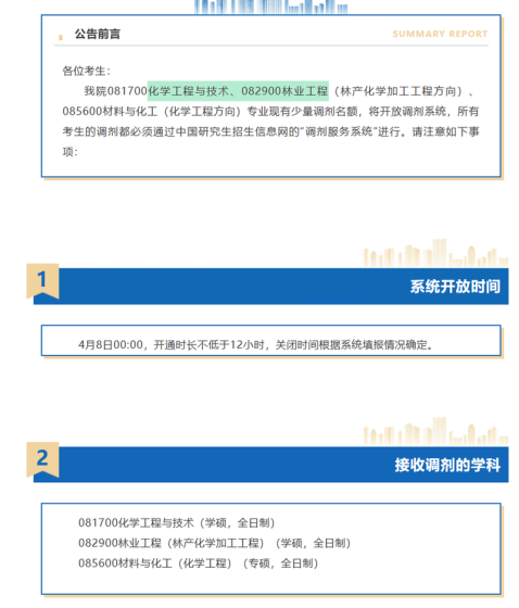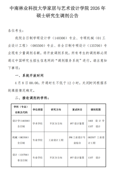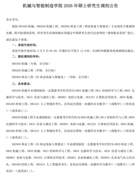 材料与能源学院 2026 年硕士研究生调剂公告各位考生:我院各学科现有调剂名额,将开放调剂系统,所有考生的调剂都必须通过“全国硕士生招生调剂服务系统”进行。请注意如下事项:一、系统开放时间:系统开始开放时间 4 月 8 日 00:00,开通时长不低于 12 小时,关闭时间根据系统填报情况确定。二、接收调剂的学科:082900 林业工程(学硕/全日制)、0829Z1 碳达峰碳中和(学硕/全日制)、080500材料科学与工程(学硕/全日制)、0805Z1 新能源技术和储能技术(学硕/全日制)、085600 材料与化工(专硕/全日制)。以上专业均不接收退役大学生