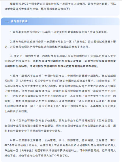 根据我校2026年硕士研究生招生计划和一志愿考生录取情况,部分学科专业有缺额,可以接收全国范围内优秀考生调剂申请,现将有关调剂事宜公告如下:一、调剂基本要求1.初试成绩须达到调出学科专业A区国家线及我校调入学科专业复试资格线。符合招生简章中规定的调入专业的报考条件和各招生学院规定的条件。2.原则上,调剂考生第一志愿报考专业与调入专业相同相近,或初试科目与调入专业初试科目相同相近。各招生学院专业调剂招生中涉及考生第一志愿专业范围等学术要求及其他要求,详见各招生学院复试细则及研招网调剂服务系统公布信息。3.第一