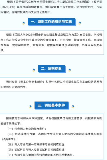 根据我校2026年硕士研究生招生计划和一志愿考生录取情况,部分学科专业有缺额,可以接受全国范围内优秀考生调剂申请,现将有关调剂事宜公告如下:一、调剂基本要求1.初试成绩须达到调出学科专业一区国家线及我校调入学科专业复试资格线。符合招生简章中规定的调入专业的报考条件和各招生学院规定的条件。2.原则上,调剂考生第一志愿报考专业与调入专业相同相近,或初试科目与调入专业初试科目相同相近。各招生学院专业调剂招生中涉及考生第一志愿专业范围及初试科目等方面要求,详见各招生学院调剂工作实施细则及研招网调剂服务系统公布信