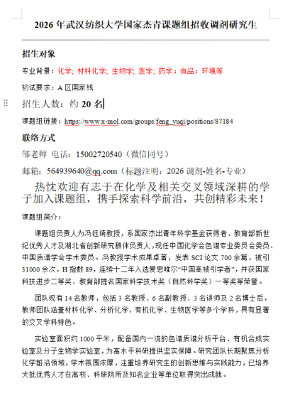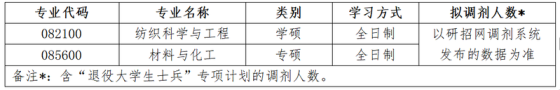 根据武汉纺织大学2026年硕士研究生招生计划和第一志愿复试拟录取情况,我院纺织科学与工程学硕、材料与化工专硕面向全国考生接受调剂,调剂公告如下:一、调剂专业及人数二、调剂条件(1)符合调入专业(纺织科学与工程、材料与化工)的报考条件。(2)初试成绩符合第一志愿报考专业及调入专业在《2026年全国硕士研究生招生考试考生进入复试的初试成绩基本要求》中的A线要求。(3)调入专业应与第一志愿报考专业相同或相近。(4)第一志愿报考专业初试科目与调入专业初试科目相同或相近。(5)报考“退役大学生士兵”专项计划的考生,申请