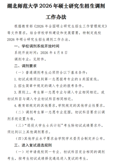 根据教育部《2026年全国硕士研究生招生工作管理规定》(教学〔2025〕2号)、《关于做好2026年湖北省硕士研究生复试录取工作的通知》(鄂招办〔2026〕5号)和学校《2026年硕士研究生复试录取工作方案》要求,为做好我校2026年研究生招生调剂工作,现将有关事宜公告如下:一、调剂时间1.调剂系统将于4月8日开放,第一轮调剂时间不低于12小时。2.第一批调剂复试具体时间及复试形式详见各招生学院调剂公告。调剂系统最终关闭时间以教育部通知为准。二、调剂基本条件调剂考生初试成绩须符合第一志愿报考专业达到国家线A区复试初试线,并符合调入