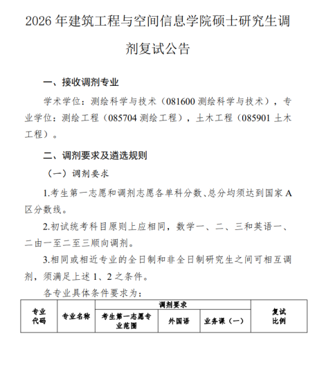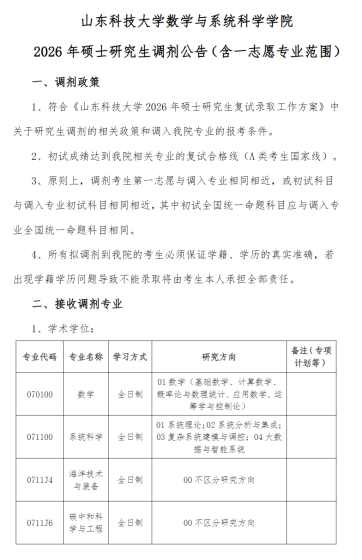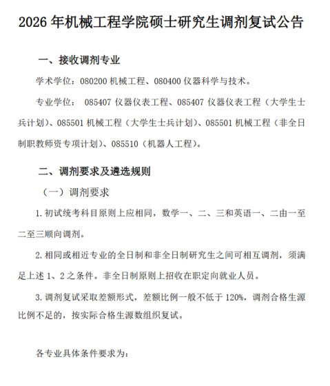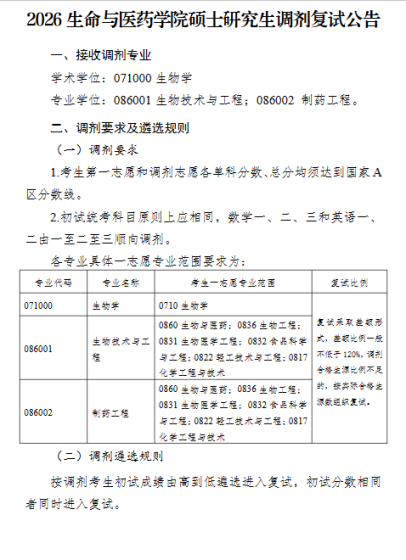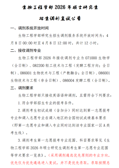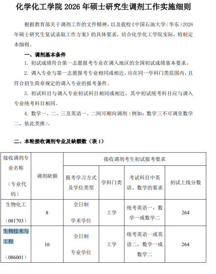 一、调剂系统开放时间化学与制药学部研究生招生调剂服务系统开放时间为:4月8日00:00时至4月8日12:00时,共计12小时。二、接收调剂专业化学与制药学部2026年接收调剂专业为070300化学、081700化学工程与技术、085602化学工程、085602化学工程(产教融合)、105500药学(产教融合)。三、调剂要求化学与制药学部只接收英语语种调剂,且需符合下列要求:1.符合学部招生专业的报考条件。2.调剂考生初试成绩(含加分)同时达到第一志愿报考专业和调入志愿专业在调入地区的全国初试成绩基本要求(即第一志愿专业和调入专业同时达到该专业国家一