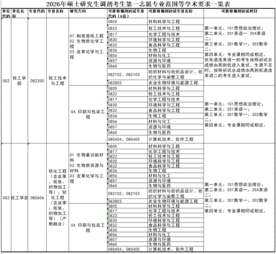 一、调剂系统开放时间轻工学部、绿色造纸与资源循环全国重点实验室研究生招生调剂服务系统开放时间为:4月8日00:00时至4月8日12:00时,共计12小时。二、接收调剂专业082200 轻工技术与工程方向1.制浆造纸工程方向2.生物质化学工程方向3.皮革化学与工程方向4.印刷与包装工程085606 材料与化工-轻化工程方向1.生物基功能材料方向2.生物质资源与材料方向3.皮革化学与工程方向4.印刷与包装工程085606 材料与化工-轻化工程(产教融合)方向1.生物基功能材料方向2.生物质资源与材料方向3.皮革化学与工程方向4.印刷与包装工程三、调剂要求轻工学部