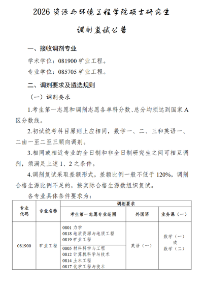 一、调剂系统开放时间能源与动力工程学部研究生招生调剂服务系统开放时间为:4月8日00:00时至4月8日12:00时,共计12小时。二、接收调剂专业:专业代码:085807 清洁能源技术专业代码:085808 储能技术三、调剂要求学部(学院)只接收英语语种调剂,且需符合下列要求:1.符合能源学部招生专业的报考条件。2.调剂考生初试成绩(含加分)同时达到第一志愿报考专业和调入志愿专业在调入地区的全国初试成绩基本要求(即第一志愿专业和调入专业同时达到该专业国家一区A类考生线)。3.调剂考生第一志愿报考专业范围、科目要求等见附件2:能源学部