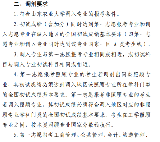 2026年我校部分专业有调剂名额,具体调剂缺额信息以研招网调剂系统公布为准。 一、调剂基本条件 1.符合《2026年全国硕士研究生招生工作管理规定》和《青岛农业大学2026年硕士研究生复试录取工作方案》中的相关要求; 2.符合调入专业的报考条件,其中以同等学力身份报考的考生,须进修过5门及以上与报考专业相关的本科主干课程且成绩合格。 各学院拟调剂专业、对一志愿考生报考专业的要求等见附件。 二、调剂程序 1.考生应于规定时间内在中国研究生招生信息网登陆“全国硕士研究生招生调剂服务系统”填写调剂申请。我校首