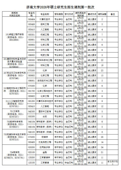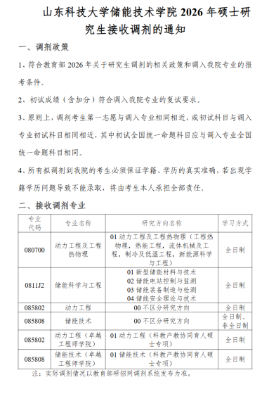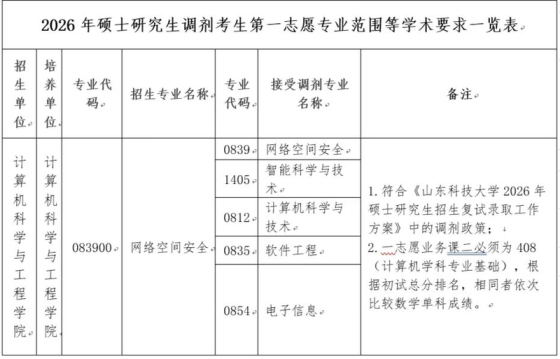 、调剂政策1.符合《山东科技大学2026年硕士研究生复试录取工作方案》中关于研究生调剂的相关政策和调入我院专业的报考条件。2.符合调入学院相关专业的复试要求。3.原则上,调剂考生一志愿与调入专业相同或相近,或初试科目与调入专业初试科目相同或相近,其中初试全国统一命题科目应与调入专业全国统一命题科目相同。4.所有拟调剂到我院的考生必须保证学籍、学历的真实准确,若出现学籍学历问题导致不能录取将由考生本人承担全部责任。二、接收调剂专业及计划专业代码专业名称研究方向名称学习方式拟调剂名额085700资源与环境安全工程全日