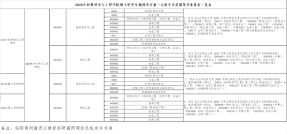 我院拟接收优秀调剂生源,欢迎调剂考生密切关注我校研究生招生信息网和我院网站。具体事项通知如下。一、接收调剂专业专业代码专业名称学习方式学位类型拟接收调剂人数080500材料科学与工程全日制学术学位61085601材料工程全日制专业学位109注:最终具体调剂名额以中国研究生招生信息网“全国硕士生招生调剂服务系统”公布的调剂信息为准。二、调剂基本要求(1)符合调入专业的报考条件。(2)调剂考生初试成绩须符合第一志愿报考专业和我校调入专业的全国初试成绩基本要求(A类)。(3)调入专业应与本人第一志愿报考专业相同或相近,接收