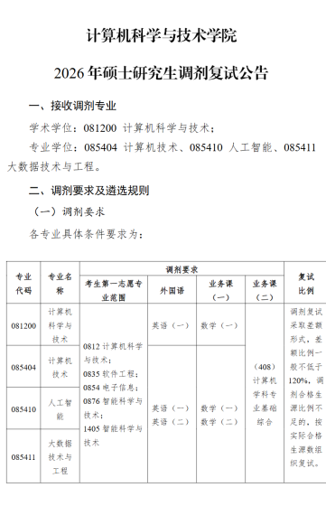 2026年“全国硕士生招生复试调剂服务系统”将于4月8日开通,我校硕士研究生调剂工作将同步开启。学校按批次发布调剂计划余额,每次开放调剂系统持续时间不低于12个小时。二、调剂程序1.所有调剂考生均须通过教育部“全国硕士生招生复试调剂服务系统”(https://yz.chsi.com.cn/yztj)填报志愿。考生调剂志愿锁定时间不超过36小时,超过36小时自行解锁。期间考生若申请解锁,请在考生留言区留言(考生姓名+考生编号+申请解锁)。2.学校通过调剂服务系统发送复试通知,请调剂考生及时关注并在规定时间内确认,否则视为自动放弃。各批次调剂考
