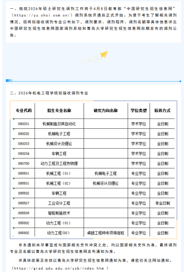 一、招生调剂专业电气工程一级学科调剂名额学硕13名。具体要求如下。专业代码专业名称学习方式及学位类型拟调剂计划(人)专业要求备注080800电气工程全日制学硕13只接收一志愿专业代码前四位为0808和专业代码为085801的考生,参加2026年全国研究生统一入学考试(考试科目:数一、英一)且达到国家录取分数线以上的考生(无论报考学硕还是专硕)可报名参加调剂二、调剂注意事项1.调剂工作(含校内调剂)一律通过中国研究生招生信息网调剂系统进行,接收调剂网上报名时间为2026年4月8日(具体时间以青岛大学研究生院公布为准)考生登陆调剂