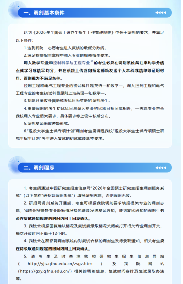 为规范调剂工作程序,提升服务质量,确保择优选拔,根据《教育部关于印发〈2026年全国硕士研究生招生工作管理规定〉的通知》(教学〔2025〕2号)、《关于做好2026年全国硕士研究生招生复试录取工作的通知》(教学司〔2026〕3号)、《山东省教育招生考试院关于做好山东省2026年硕士研究生复试录取工作的通知》(鲁招考〔2026〕26号)等文件精神,结合我校实际,制定本办法。一、基本原则1.坚持“按需招生、全面衡量、择优录取、宁缺毋滥”原则,确保选拔考核科学有效。2.坚持以人为本,增强服务意识,做到政策透明、程序公正、结果公开、监