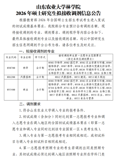 根据教育部和山东省教育招生考试院2026年硕士研究生复试录取工作要求,结合我校招生计划和一志愿复试情况,现将我校2026年调剂相关工作公告如下。拟接收调剂计划信息根据生源情况适当调整,接收调剂的专业范围以研招网调剂系统最终公布的信息为准。一、调剂要求1.考生需达到2026年国家线A类考生(一区)单科和总分分数线,且符合报考学院调剂要求。2.考生第一志愿报考专业需与拟调剂专业相同或相近,或与拟调剂专业初试科目相同或相近。3.“退役大学生士兵”专项计划考生调剂的初试成绩不得低于我校自主划定的“退役大学生士兵”专项计划初