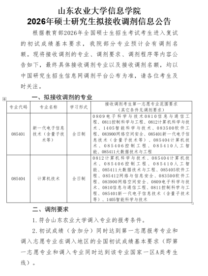 为规范研究生招生调剂工作程序,确保择优选拔,根据《教育部关于印发2026年全国硕士研究生招生工作管理规定的通知》(教学〔2025〕2号)、教育部学生司《关于做好2026年全国硕士研究生招生复试录取工作的通知》(教学司〔2026〕3号)和山东省教育招生考试院《关于做好山东省2026年硕士研究生招生复试录取工作的通知》(鲁招考〔2026〕26号)等文件及相关会议精神,结合我校实际,制定本办法。一、接收调剂专业(领域)1.电子信息(0854)085408光电信息工程,二级单位:物理与电子工程学院085412网络与信息安全,二级单位:信息科学技术学院0854