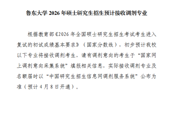 欢迎广大考生报考烟台大学:我校2026年硕士研究生调剂工作将从教育部“中国研究生招生信息网”(https://yz.chsi.com.cn/)调剂系统开通后正式开始,预计部分专业可接收调剂,拟调剂专业见下表。具体通知将于调剂系统开通前发布,请关注烟台大学研究生处网站(https://yjs.ytu.edu.cn/)及研招网调剂系统的最新消息。相关参考通知:烟台大学2026年硕士研究生招生章程https://yjs.ytu.edu.cn/info/1015/2861.htm烟台大学2026年硕士研究生招生复试录取工作方案https://yjs.ytu.edu.cn/info/1016/2969.htm烟台大学2026年硕士研究生招生考试一