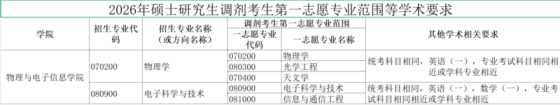 我院2026年硕士研究生调剂工作将于4月8日教育部“中国研究生招生信息网”调剂系统开通后正式开始,调剂招生名额为:物理学46,学科教学(物理)10,光电信息工程23,材料工程38(名额最终以研招网公布为准)。为便于考生了解相关调剂情况,现将调剂要求、拟接收调剂专业等信息公布如下,有调剂需求考生可在国家预调剂系统报名,及时填报意向信息。一、调剂要求严格按照学校规定的调剂原则开展调剂工作。具体专业及缺额信息以中国研究生招生信息网“全国硕士生招生调剂服务系统”公布的调剂信息为准。调剂基本要求如下:1.符合调入专业的报