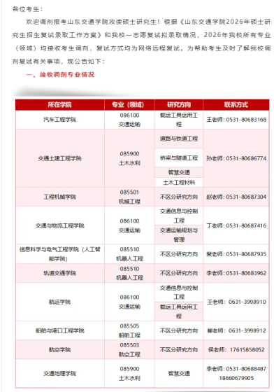 一、调剂政策1、符合《山东科技大学2026年硕士研究生复试录取工作方案》中关于研究生调剂的相关政策和调入我院专业的报考条件。2、初试成绩(含加分)符合调入我院专业的复试要求。3、原则上,调剂考生第一志愿与调入专业相同相近,或初试科目与调入专业初试科目相同相近,其中初试全国统一命题科目应与调入专业全国统一命题科目相同。(调剂考生第一志愿专业范围及学术要求详见学院网站后续通知)。4、所有拟调剂到我院的考生必须保证学籍、学历的真实准确,若出现学籍学历问题导致不能录取将由考生本人承担全部责任。5.原则上非全日制研