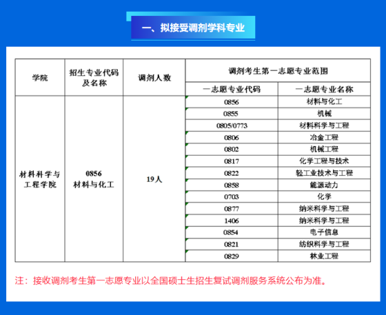 我院2026年硕士研究生调剂工作将于4月8日教育部“中国研究生招生信息网”(https://yz.chsi.com.cn/)调剂系统开通后正式开始。为便于考生了解相关调剂情况,现将拟接收调剂专业公布如下,调剂要求、调剂程序、调剂名额等具体信息详见中国研究生招生信息网国家调剂系统和青岛大学研究生招生信息网后期发布的调剂公告。有调剂需求考生可于3月27日国家“网上调剂意向采集系统”开通后,及时填报意向信息。一、拟接收调剂专业(具体专业以青岛大学研究生招生信息网站通知为准)专业代码专业名称学位类型082101纺织工程学术学位082102纺织材料