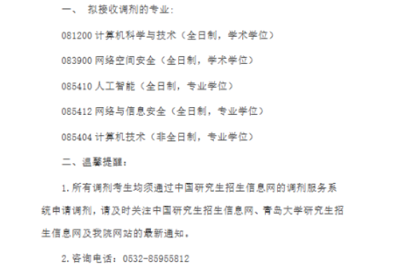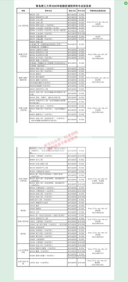 我院2026年硕士研究生调剂工作将于4月8日教育部“中国研究生招生信息网”(https://yz.chsi.com.cn/)调剂系统开通后正式开始。为便于考生了解相关调剂情况,现将拟接收调剂专业公布如下,调剂要求、调剂程序、调剂名额等具体信息详见中国研究生招生信息网国家调剂系统和青岛大学研究生招生信息网后期发布的调剂公告。有调剂需求考生可在国家“网上调剂意向采集系统”报名,及时填报意向信息。一、拟接收调剂专业专业代码专业名称学位类型学习方式070300化学学术学位全日制081700化学工程与技术学术学位全日制085602化学工程专业学位全日制