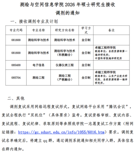 我院2026年硕士研究生调剂工作将于4月8日教育部“中国研究生招生信息网”(https://yz.chsi.com.cn/)调剂系统开通后正式开始。为便于考生了解相关调剂情况,现将拟接收调剂专业公布如下,调剂要求、调剂程序、调剂名额等具体信息详见中国研究生招生信息网国家调剂系统和青岛大学研究生招生信息网后期发布的调剂公告。有调剂需求考生可在国家预调剂系统报名,及时填报意向信息。一、拟接收调剂专业专业代码专业名称学位类型学习方式080500材料科学与工程学术学位全日制085601材料工程专业学位全日制二、预调剂要求1、欢迎材料、化工、化学