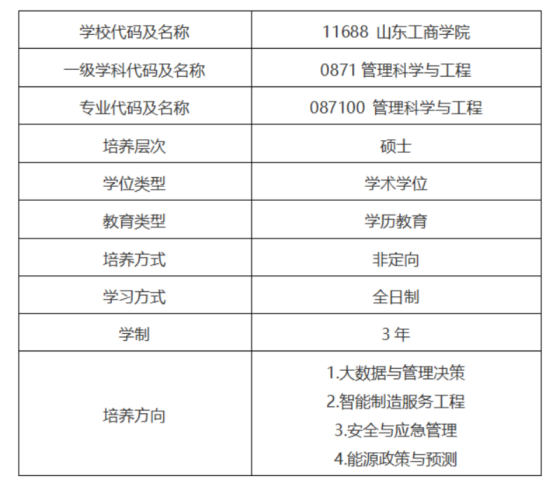山东工商学院管理科学与工程专业学硕(专业代码:087100)接受调剂考生,具体接收调剂考生数量以中国研究生招生信息网调剂系统公布为准,数量充足,欢迎报考。一、调剂基本条件1.初试科目原则上应与调入专业初试科目相同或相近,其中统考科目应包括英语和数学。2.初试成绩达到一志愿报考专业国家分数线和[08]工学其他学科专业(非工学照顾专业)A类考生(一区)国家分数线。3.符合山东工商学院2026年硕士研究生招生章程(https://yjs.sdtbu.edu.cn/info/1048/3994.htm)中规定的报考条件。4.必须保证学籍学历真实准确,若出现学籍学历问题