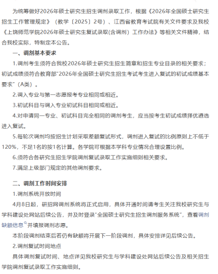 根据《2026年全国硕士研究生招生工作管理规定》(教学〔2025〕2号)《关于做好2026年全国硕士研究生招生复试录取工作的通知》(教学司〔2026〕3号)以及江西省教育考试院有关文件要求,结合我校各学科(专业)招生计划和一志愿复试情况,我校尚有学科(专业)可接受考生调剂。经研究决定,我校2026年硕士研究生招生调剂复试于4月9日开始,采取现场复试形式。现将调剂复试相关工作事项公布如下:一、调剂基本条件(一)调剂考生初试成绩须符合第一志愿报考专业在《2026年全国硕士研究生招生考试考生进入复试的初试成绩基本要求》中A区的全国初试