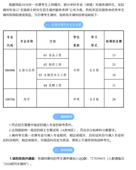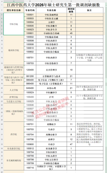 根据江西中医药大学2026年硕士研究生招生计划及一志愿复试录取情况,部分学科专业(方向)可接受调剂。现将江西中医药大学调剂工作有关事项通知如下,欢迎各位考生积极申请调剂: