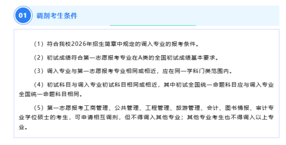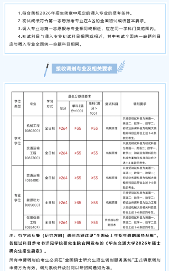 根据我校2026年硕士研究生招生计划及一志愿复试录取基本情况,我校部分学科专业(方向)可接受考生调剂。现将我校调剂工作的有关事项通知如下,欢迎全国各地优秀考生积极申请我校调剂:一、调剂基本要求(一)须符合我校《2026年硕士研究生招生简章及招生专业目录》公布的调入专业报考条件(包括各专业备注栏中的要求)。(二)初试成绩符合第一志愿报考专业在A区的初试成绩基本要求。(三)调入专业与第一志愿报考专业相同或相近。(四)初试科目与调入专业初试科目相同或相近,其中初试全国统一命题科目与调入专业全国统一命题科目原则上